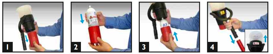 - 4 : Lắp Solo 330 vào cây tay cầm. Đặt Solo 330 trên đầu báo khói và ấn lên để chai tạo khói hoạt động (trong vòng 1s)