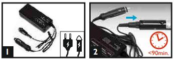 - 2 : Gắn pin vào bộ sạc đèn led sáng nhấp nháy đỏ/ xanh. Led màu đỏ hiển thị đang sạc. Đèn sẽ sáng xanh khi sạc đầy. Nếu đèn led nhấp nháy màu đỏ, có thể pin bị lỗi.