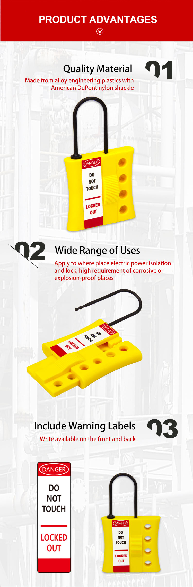 Khóa cách điện Hasp BD-8341 có thể được khóa để ngăn chặn việc vận hành nguồn điện hoặc thiết bị bị cô lập một cách tùy tiện cho đến khi quá trình cô lập hoàn tất và Khóa/Thẻ được gỡ bỏ. Trong khi đó, bằng cách sử dụng Thẻ khóa để cảnh báo mọi người rằng nguồn điện hoặc thiết bị bị cô lập không được vận hành tùy tiện.